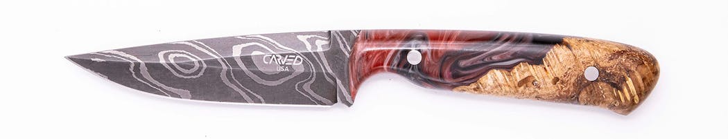 Carved Knives are hand forged, ground and sharpened Damascus Steel blades. Every single blade is forged and ground by hand, no CNC touches our blades. Once the blade is ready, we match it with our one-of-a-kind Wood+Resin material that guarantees no one will have a knife like yours. The handle is then sanded smooth and polished to a fine semi-gloss finish. We have gone to great lengths to ensure the quality of this blade will last a lifetime and is something that you will be proud to pass on. Each knife is 100% Made in America. The blade, the sheath, the handle. Everything.