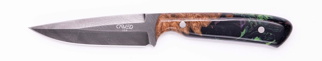 Carved Knives are hand forged, ground and sharpened Damascus Steel blades. Every single blade is forged and ground by hand, no CNC touches our blades. Once the blade is ready, we match it with our one-of-a-kind Wood+Resin material that guarantees no one will have a knife like yours. The handle is then sanded smooth and polished to a fine semi-gloss finish. We have gone to great lengths to ensure the quality of this blade will last a lifetime and is something that you will be proud to pass on. Each knife is 100% Made in America. The blade, the sheath, the handle. Everything.