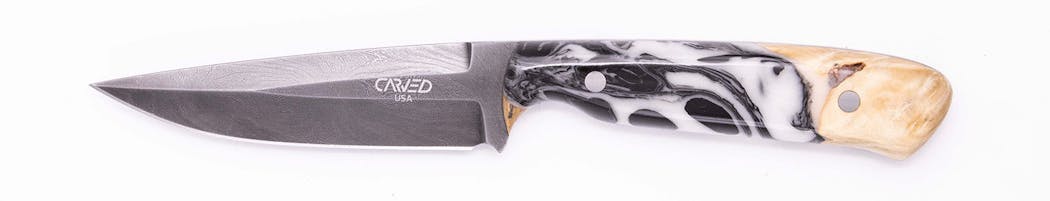 Carved Knives are hand forged, ground and sharpened Damascus Steel blades. Every single blade is forged and ground by hand, no CNC touches our blades. Once the blade is ready, we match it with our one-of-a-kind Wood+Resin material that guarantees no one will have a knife like yours. The handle is then sanded smooth and polished to a fine semi-gloss finish. We have gone to great lengths to ensure the quality of this blade will last a lifetime and is something that you will be proud to pass on. Each knife is 100% Made in America. The blade, the sheath, the handle. Everything.