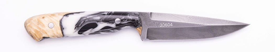 We use 1084 and 15N20 steel that is heated and forged in a twist pattern, resulting in an incredibly hard knife that will keep a nice, sharp edge. The blade is ground by hand, heat treated and then etched. The handle is cut from wood burls, mixed with resin, then formed, sanded and polished to a mirror-like finish.