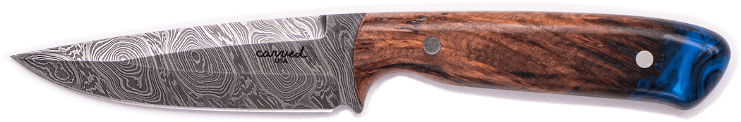Carved Knives are hand forged, ground and sharpened Damascus Steel blades. Every single blade is forged and ground by hand, no CNC touches our blades. Once the blade is ready, we match it with our one-of-a-kind Wood+Resin material that guarantees no one will have a knife like yours. The handle is then sanded smooth and polished to a fine semi-gloss finish. We have gone to great lengths to ensure the quality of this blade will last a lifetime and is something that you will be proud to pass on. Each knife is 100% Made in America. The blade, the sheath, the handle. Everything.