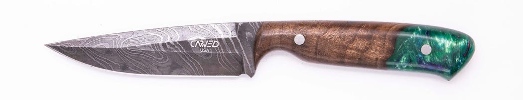 Carved Knives are hand forged, ground and sharpened Damascus Steel blades. Every single blade is forged and ground by hand, no CNC touches our blades. Once the blade is ready, we match it with our one-of-a-kind Wood+Resin material that guarantees no one will have a knife like yours. The handle is then sanded smooth and polished to a fine semi-gloss finish. We have gone to great lengths to ensure the quality of this blade will last a lifetime and is something that you will be proud to pass on. Each knife is 100% Made in America. The blade, the sheath, the handle. Everything.