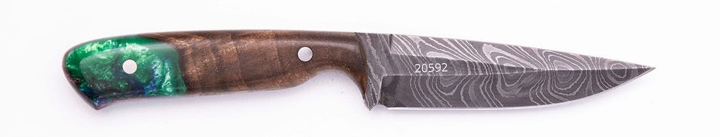 We use 1084 and 15N20 steel that is heated and forged in a twist pattern, resulting in an incredibly hard knife that will keep a nice, sharp edge. The blade is ground by hand, heat treated and then etched. The handle is cut from wood burls, mixed with resin, then formed, sanded and polished to a mirror-like finish.