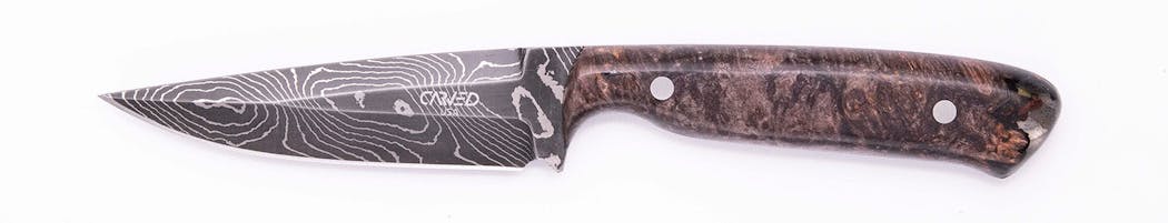 Carved Knives are hand forged, ground and sharpened Damascus Steel blades. Every single blade is forged and ground by hand, no CNC touches our blades. Once the blade is ready, we match it with our one-of-a-kind Wood+Resin material that guarantees no one will have a knife like yours. The handle is then sanded smooth and polished to a fine semi-gloss finish. We have gone to great lengths to ensure the quality of this blade will last a lifetime and is something that you will be proud to pass on. Each knife is 100% Made in America. The blade, the sheath, the handle. Everything.