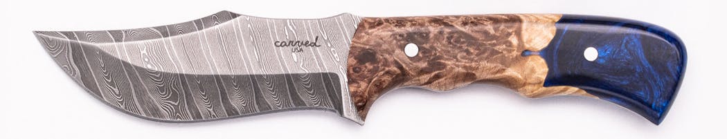 Carved Knives are hand forged, ground and sharpened Damascus Steel blades. Every single blade is forged and ground by hand, no CNC touches our blades. Once the blade is ready, we match it with our one-of-a-kind Wood+Resin material that guarantees no one will have a knife like yours. The handle is then sanded smooth and polished to a fine semi-gloss finish. We have gone to great lengths to ensure the quality of this blade will last a lifetime and is something that you will be proud to pass on. Each knife is 100% Made in America. The blade, the sheath, the handle. Everything.