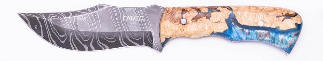 Carved Knives are hand forged, ground and sharpened Damascus Steel blades. Every single blade is forged and ground by hand, no CNC touches our blades. Once the blade is ready, we match it with our one-of-a-kind Wood+Resin material that guarantees no one will have a knife like yours. The handle is then sanded smooth and polished to a fine semi-gloss finish. We have gone to great lengths to ensure the quality of this blade will last a lifetime and is something that you will be proud to pass on. Each knife is 100% Made in America. The blade, the sheath, the handle. Everything.
