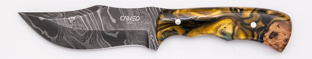 Carved Knives are hand forged, ground and sharpened Damascus Steel blades. Every single blade is forged and ground by hand, no CNC touches our blades. Once the blade is ready, we match it with our one-of-a-kind Wood+Resin material that guarantees no one will have a knife like yours. The handle is then sanded smooth and polished to a fine semi-gloss finish. We have gone to great lengths to ensure the quality of this blade will last a lifetime and is something that you will be proud to pass on. Each knife is 100% Made in America. The blade, the sheath, the handle. Everything.