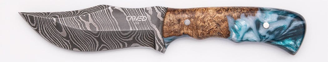 Carved Knives are hand forged, ground and sharpened Damascus Steel blades. Every single blade is forged and ground by hand, no CNC touches our blades. Once the blade is ready, we match it with our one-of-a-kind Wood+Resin material that guarantees no one will have a knife like yours. The handle is then sanded smooth and polished to a fine semi-gloss finish. We have gone to great lengths to ensure the quality of this blade will last a lifetime and is something that you will be proud to pass on. Each knife is 100% Made in America. The blade, the sheath, the handle. Everything.