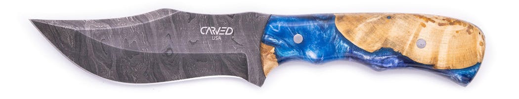 Carved Knives are hand forged, ground and sharpened Damascus Steel blades. Every single blade is forged and ground by hand, no CNC touches our blades. Once the blade is ready, we match it with our one-of-a-kind Wood+Resin material that guarantees no one will have a knife like yours. The handle is then sanded smooth and polished to a fine semi-gloss finish. We have gone to great lengths to ensure the quality of this blade will last a lifetime and is something that you will be proud to pass on. Each knife is 100% Made in America. The blade, the sheath, the handle. Everything.
