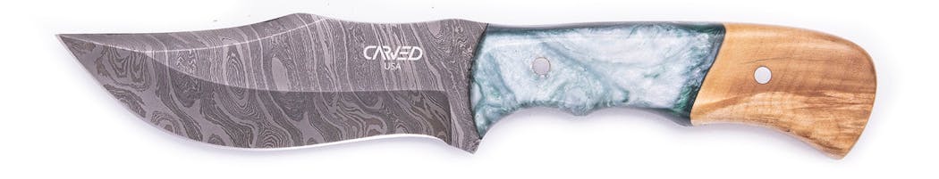 Carved Knives are hand forged, ground and sharpened Damascus Steel blades. Every single blade is forged and ground by hand, no CNC touches our blades. Once the blade is ready, we match it with our one-of-a-kind Wood+Resin material that guarantees no one will have a knife like yours. The handle is then sanded smooth and polished to a fine semi-gloss finish. We have gone to great lengths to ensure the quality of this blade will last a lifetime and is something that you will be proud to pass on. Each knife is 100% Made in America. The blade, the sheath, the handle. Everything.