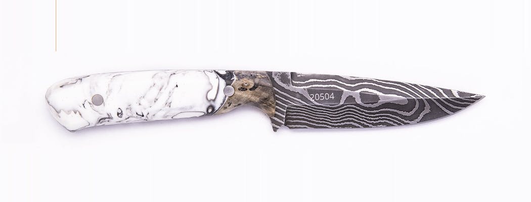 Carved Knives are hand forged, ground and sharpened Damascus Steel blades. Every single blade is forged and ground by hand, no CNC touches our blades. Once the blade is ready, we match it with our one-of-a-kind Wood+Resin material that guarantees no one will have a knife like yours. The handle is then sanded smooth and polished to a fine semi-gloss finish. We have gone to great lengths to ensure the quality of this blade will last a lifetime and is something that you will be proud to pass on. Each knife is 100% Made in America. The blade, the sheath, the handle. Everything.