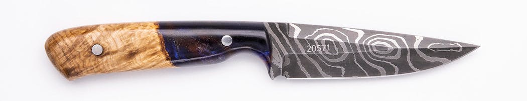 We use 1084 and 15N20 steel that is heated and forged in a twist pattern, resulting in an incredibly hard knife that will keep a nice, sharp edge. The blade is ground by hand, heat treated and then etched. The handle is cut from wood burls, mixed with resin, then formed, sanded and polished to a mirror-like finish.