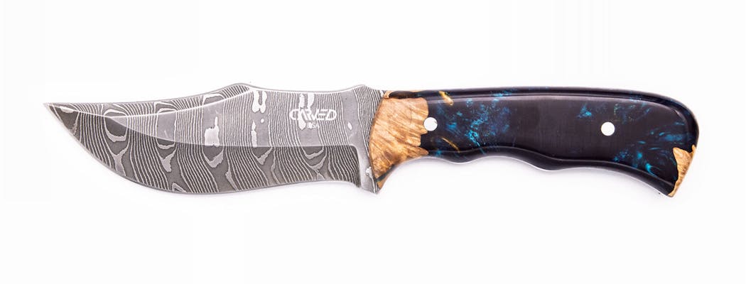 Carved Knives are hand forged, ground and sharpened Damascus Steel blades. Every single blade is forged and ground by hand, no CNC touches our blades. Once the blade is ready, we match it with our one-of-a-kind Wood+Resin material that guarantees no one will have a knife like yours. The handle is then sanded smooth and polished to a fine semi-gloss finish. We have gone to great lengths to ensure the quality of this blade will last a lifetime and is something that you will be proud to pass on. Each knife is 100% Made in America. The blade, the sheath, the handle. Everything.